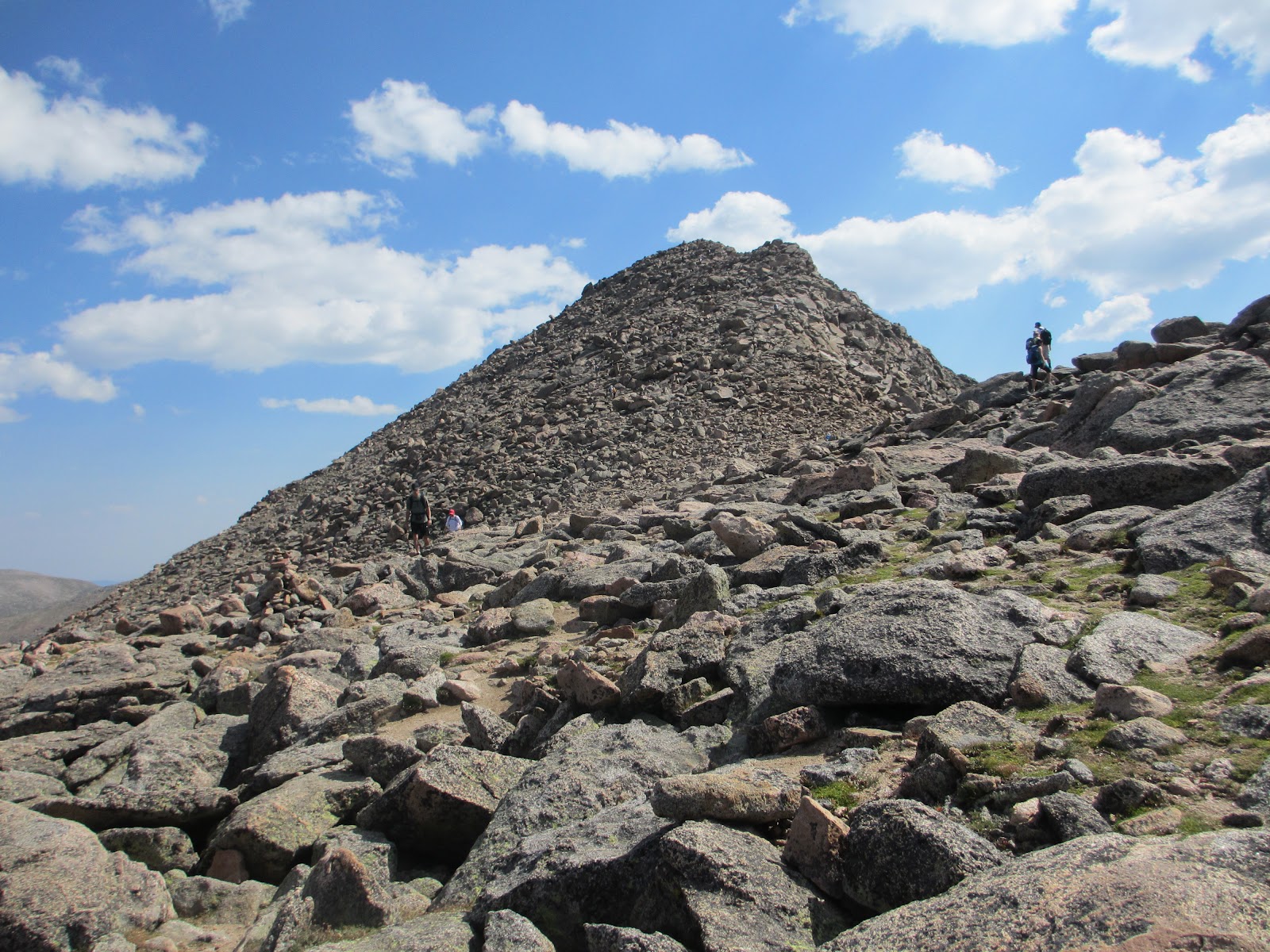 We were passed early on by a couple of fast hikers and I picked up my pace to try and keep up with them. After all, we did have some time constraints this day. About 12,400 feet, we hiked above a shoulder and got a view into the drainage below Bierstadt. I didn't take a picture of the lakes or trees, more perfect moose country, but did get a picture of the now closer summit and connecting ridge.