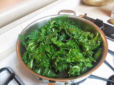 cook turnip greens. I found something, but then couldn't find any turnip greens at the store. So I settled on beet greens and Swiss chard. I put them together in a pan with vegetable broth, a little olive oil, pepper and salt, and cooked it until it wilted significantly.