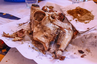 When the half sheep head was brought to our table, if I'd not known what it was, I'd not have been able to identify it. It just looked like a mass of meat with different textures. It was also covered liberally with salt and cumin. We discovered that Moroccans love their lamb slathered in cumin. I did not like cumin initially, but quickly acquired a taste for it.