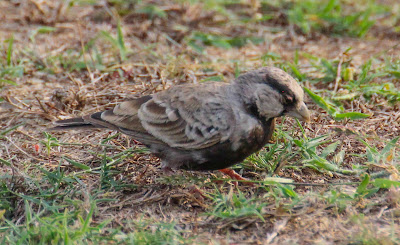 It has a bill like a finch and short legs. The male is sandy brown with a black belly, chin, lower lores and eye stripe. The female is pale brown, without all of the black,and looks like a female house sparrow. They do not perch in trees or bushes, but are usually seen on the ground.