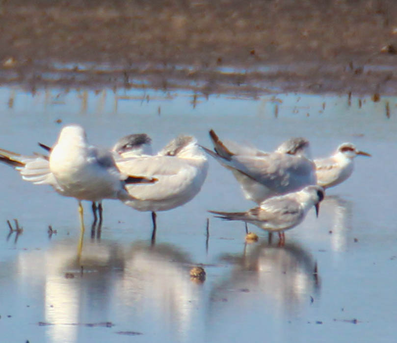 | Two Forster's terns on the far right (the front one has beak pointing down, the back one has the readily identifiable black eye mask). I'm not sure what the other birds are. |
