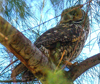 I went back to the tamarisk and this time got underneath and scanned and scanned. At one point I was kind of stunned when I could see four of them all within a few feet of each other in the tree. I think a few things were happening. One was I was starting to be able to "see" the owls, to know what to look for. I think the other was that my slow deliberate approach made it so that the owls did not flush as easily and stayed put so that I could find them.
