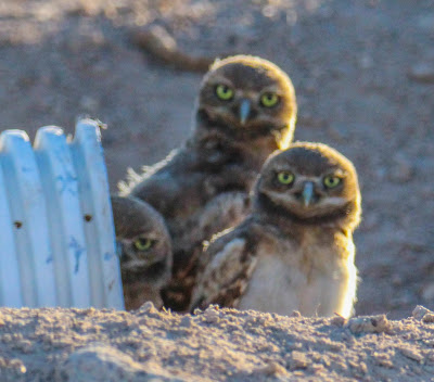 My quest to find burrowing owl owlets found success Thursday in an unexpected way. First thing in the morning, shortly after sunrise, I drove down Vendel Road (north) at the Sunny Bono Salton Sea NWR. I only saw two burrowing owls on the way in, less than usual, and not much other bird life. Right before the NWR outhouse and bird-stand, I took a left turn (west) on the dirt road marked Trifolium Fourteen Drain on the map. I drove down to the section that has the blind, now completely dry, then turned around and drove back (east) to the intersection with Vendel Road. I saw a burrowing owl standing on a post near the intersection. I'd never seen one that far north on the road before. It flew before I could take a photo of it. I started to turn right (south) on to Vendel Road, to leave, then noticed that the owl was now posted on another post about 30 yards east on the Trifolium Fourteen Drain road and I saw several owlets in a depression underneath.