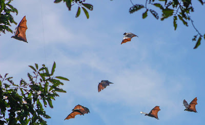 As we were walking through a section of large trees I noticed some large birds flying. I walked off a pathway onto a large area of grass towards the large birds and then it dawned on me that these were not birds at all, but large bats. Then I saw hundreds of them hanging upside down from tree limbs, then hundreds as they took to the air in flight. I was a kid in a candy store taking photos and seeing more and more of them.