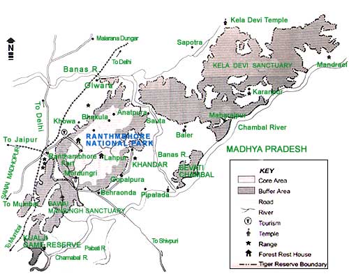 Ranthambore was originally established as Sawai Modhopur Game Sanctuary in 1955 and covered 109 square miles. In 1974 it was declared one of the first nine Tiger Reserves and in 1980 a national park. Over the years additional land has been added to it to provide a buffer for the tiger and the surrounding civilization and to provide a corridor for the tiger and other wildlife to nearby habitat. The original game sanctuary land appears to be what is now referenced on the map key above as the "core area" with good water for tigers and established tiger territories. It is the white area in the map above with "RANTHAMBORE NATIONAL PARK" emblazoned on it, surrounded by shading which is referred to in the key as "buffer area." With additions over the years, all shaded in the map above, Ranthambore now covers 515 square miles. For example, Kela Devi Sanctuary on the map, or Kailadevi Sanctuary on Wikipedia, to the northeast of the original land, was added to Ranthambore in 1983 and was an additional 261 square miles. It provides a wildlife corridor for the land in the tiger sanctuary and the Chambal River region. In 1984 the Sawai Man Singh Wildlife Sanctuary on the map was added to Ranthambore and added a 40 square mile buffer to the south of the original tiger sanctuary and provides habitat connectivity to the Aravalli and Vindhya ranges. Some time later the Kualji Close Area, that appears to be related to the Kualji Game Reserve on the map, added 2.9 square miles to the south end of Ranthambore.